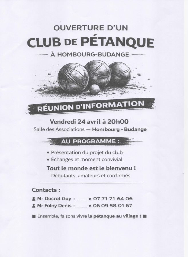Sous l’impulsion de Mrs DUCROT Guy et FOLNY Denis un nouveau club de pétanque sera créé à Hombourg-Budange.